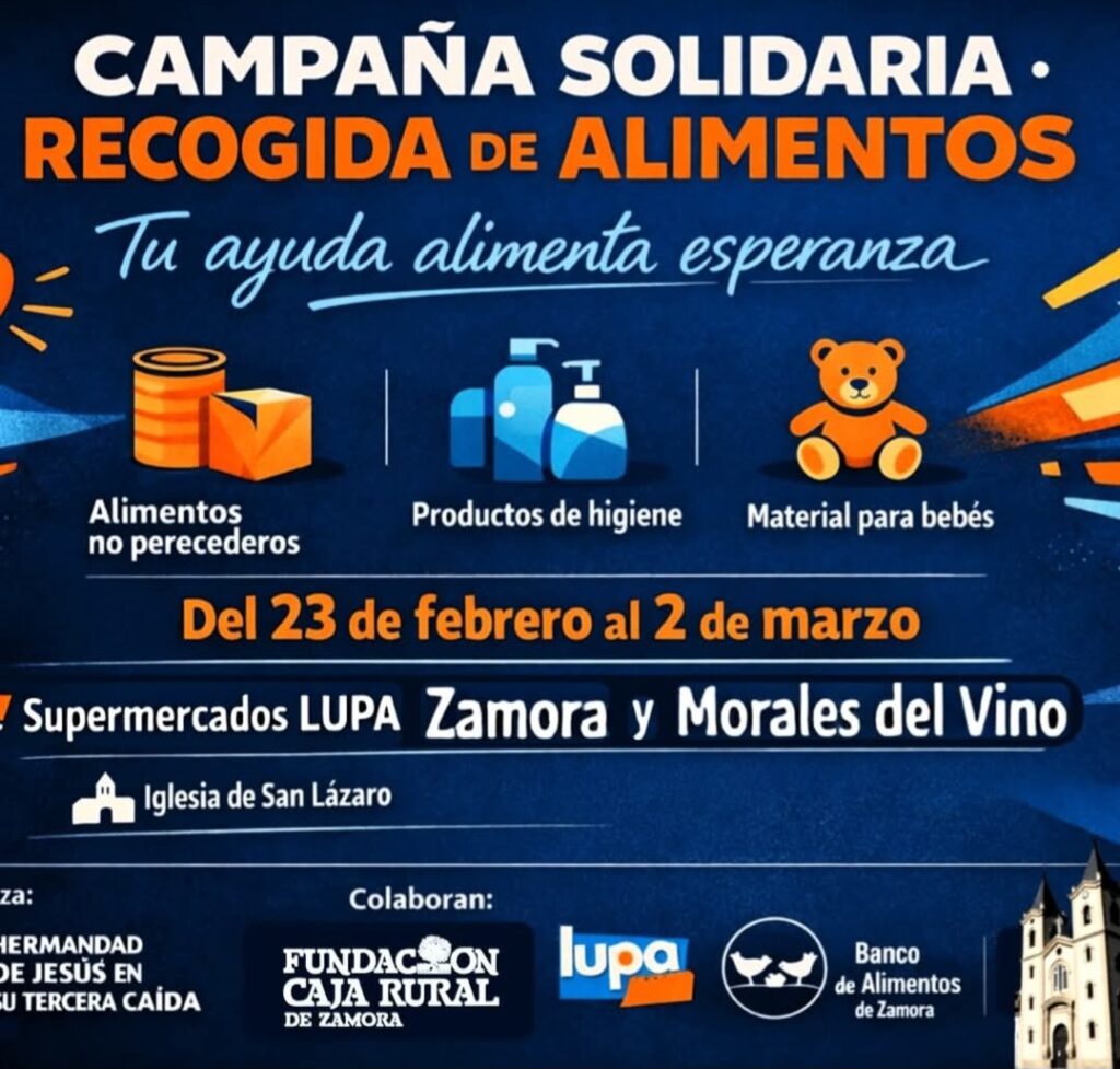 Del 23 de febrero al 2 de marzo. CampaĂąa de recogida de Alimentos para Banco de Alimentos de Zamora. Productos no perecederos, material higiĂŠnico y material para bebĂŠs. Supermercados Lupa y Banco de Alimentos.