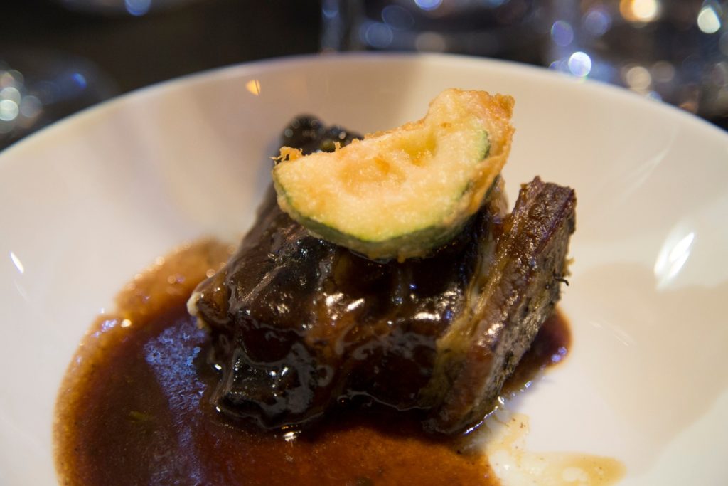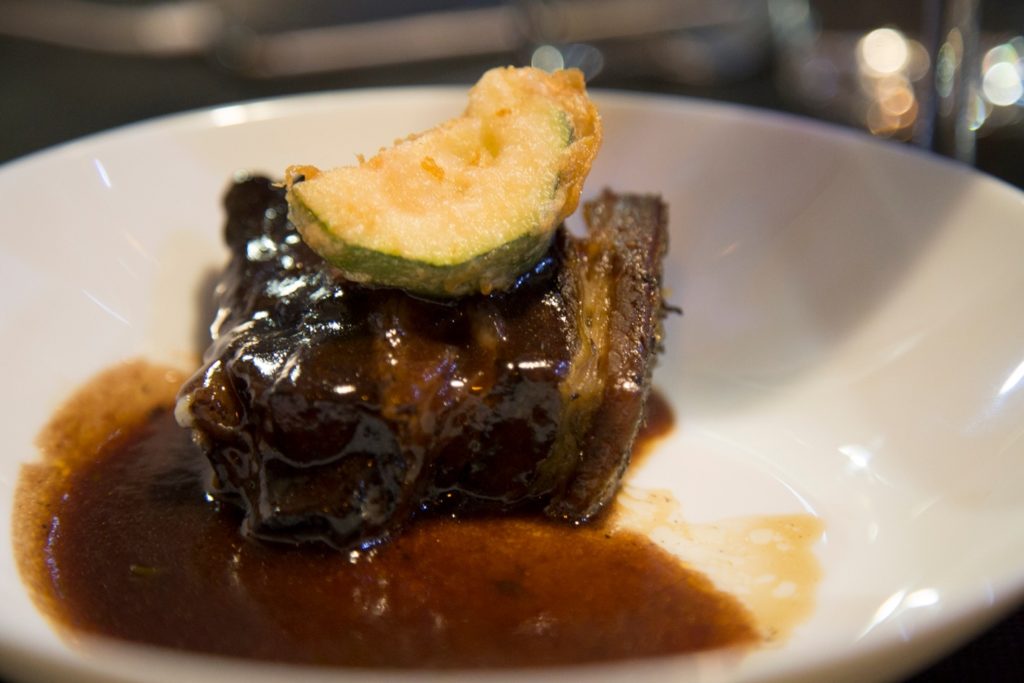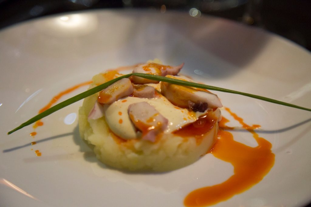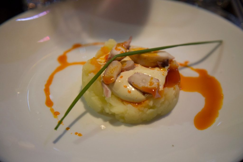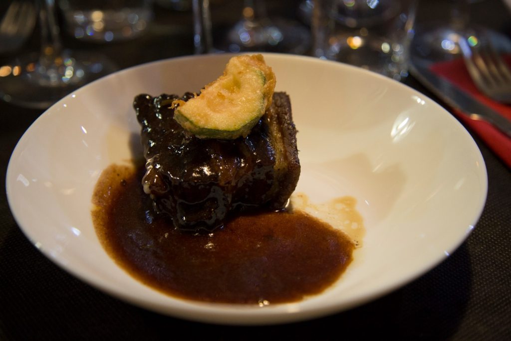 El matrimonio formado por Reyes y Adolfo sorprendían de nuevo a sus comensales con cuatro tapas de mucha altura, todo un muestrario de su buen hacer en la cocina. Así, en la jornada los asistentes pudieron degustar un gambón al horno con crumble de zanahora y chips de alcachofa, para continuar con un delicioso ‘Figón de bacalao’,  una porción de bacalao rebozado en una lamina de calabacín con crema de queso, acompañado con unas pinceladas de mayonesa de curry, que supuso una delicada explosión de sabor en la boca. La tercera propuesta era un timbal de patata y pulpo con mostaza ligera y ajo arriero, en el que destacaba la suave textura de la patata y el toque de la mostaza, para finalizar con una costilla o “presa” de ternera asada y salsa agriculce, sobre una base de cocina tradicional y con mayor contundencia, que pusieron muy difícil a los comensales decantarse por una de ellas,