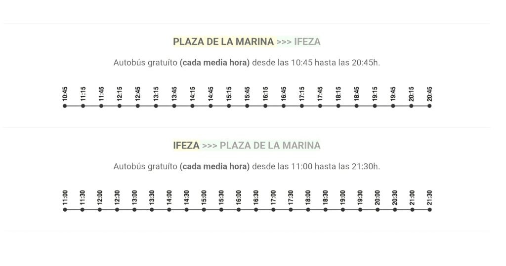 Para facilitar el acceso al recinto de Ifeza y evitar o reducir el desplazamiento en vehículos propios, la organización ha establecido un servicio especial gratuito de autobuses de ida y vuelta entre La Marina y el recinto ferial con frecuencias de media hora. Las salidas desde La Marina se organizan desde las 10.45 horas y hasta las 20.45 horas.