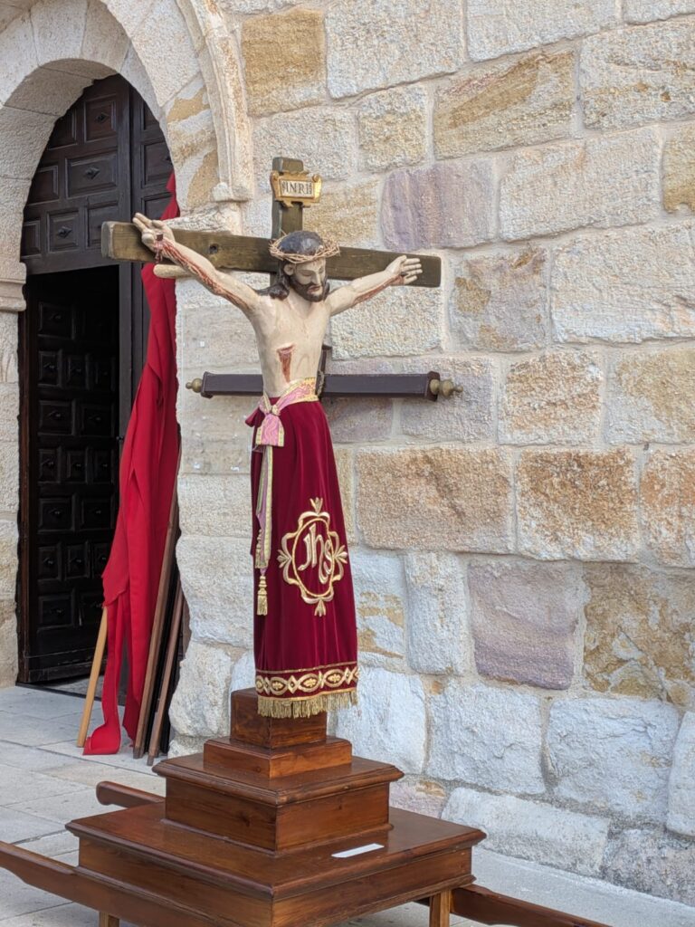 A las nueve y media de la mañana partía de la iglesia del Espíritu Santo la procesión con la imagen del Cristico, que efectúa un pequeño descanso en el puente de Croix, en el bosque de Valorio, donde los cofrades desayunan chocolate con churros, para continuar después hasta la ermita de Valderrey.