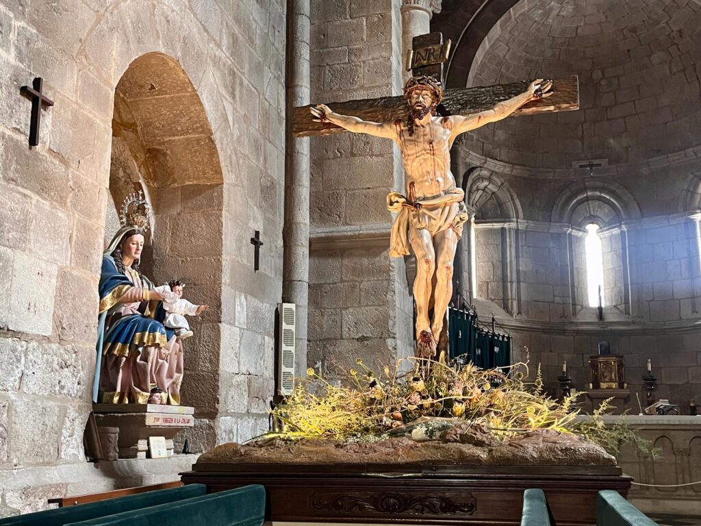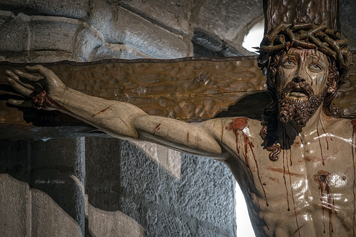 Flores a sus pies y también los nombres de quienes tanto le rezaron o lo cargaron sobre sus hombros. Fernandico, Carlos, Miguel, Javier; y la voz potente, rotunda de Juan Manuel; Paco Escuadra, Marcelino ,que nos santificaban antes de salir. Y Casimiro, que nunca faltaba en los primeros bancos. También los de aquí, los que ya no arriman el hombro y cargan con la memoria, con el corazón, siempre hermanos de paso: Florián, los dos José Carlos, Fernando padre, Nafría. La amorosa capa de los abades Los que se criaron a la sombra del Cristo como Baladrón. Las treinta primeras que salimos con manguito verde; el taller de Manolo lleno de hachones por limpiar con soplete, la cadena humana para bajarlos.y subirlos a la torre. Nos conocíamos todos por nuestros nombres.
