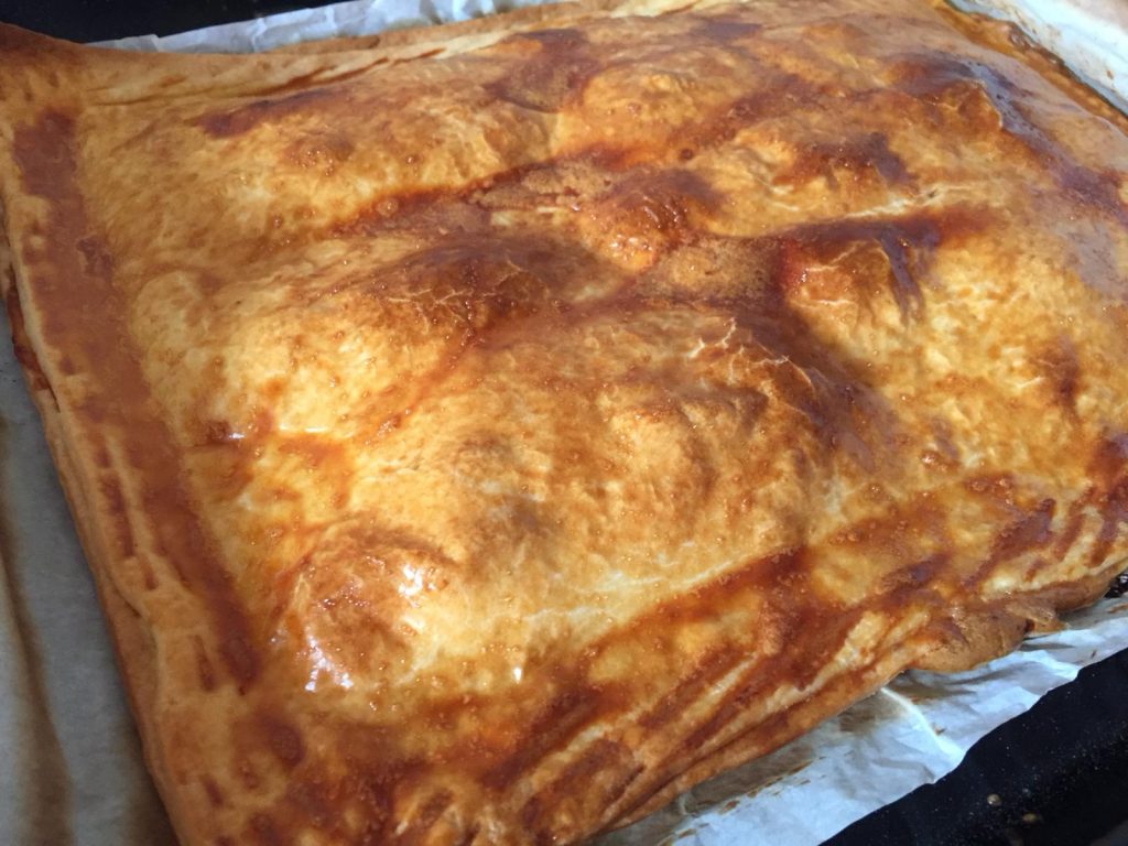 PREPARACIÓN Para la masa: Mezclamos la levadura con media taza de agua templada y una taza de harina y amasamos hasta hacer un bollo. Tapamos la masa con un paño de algodón y lo dejamos reservado hasta que doble su tamaño para que fermente. Una vez que ha fermentado, en un bol o sobre una mesa de cocina mezclamos el resto de la harina con el azafrán (opcional), añadimos sal y formamos una circunferencia. Ablandamos un poco la manteca o el aceite y la añadimos. En el centro colocamos la masa fermentada que teníamos reservada y amasamos todo, añadiendo agua templada poco a poco, hasta obtener una masa suave y elástica que no se pegue a los dedos. Tapamos con un paño de nuevo y reservamos hasta que doble su tamaño. Mientras tanto, cocemos dos huevos, pelamos el chorizo, el lomo y el salchichón y los cortamos en rodajas y las dividimos en dos partes para que no sean muy grandes. Pasamos por la sartén el lomo de cerdo fresco (vuelta y vuelta) y reservamos. Cuando ha doblado el tamaño de la masa, amasamos de nuevo durante un minuto. Extendemos la mitad de la masa con un rodillo en la bandeja del horno y colocamos encima el chorizo, el salchichón, el jamón y el lomo. A continuación cortamos los huevos cocidos en rodajas, los repartimos y cubrimos todo con la mitad de la masa sobrante, bien extendida y cerramos bien por todos lados, uniendo las dos partes de la masa. Reservamos aproximadamente una hora para que aumente su tamaño. Con un tenedor picamos la parte de arriba para que salga el aire y no se formen ampollas. Mientras tanto, precalentamos el horno a temperatura media (180 grados). Finalmente, pintamos la superficie superior de la masa con un huevo batido e introducimos en el horno una media hora hasta que se dore. Para comprobar que el hornazo está cocido, pinchamos con una aguja larga y si sale limpia, significa que el hornazo está ya cocido. Consumimos cuando esté templado o frío. |
