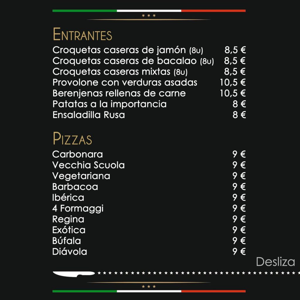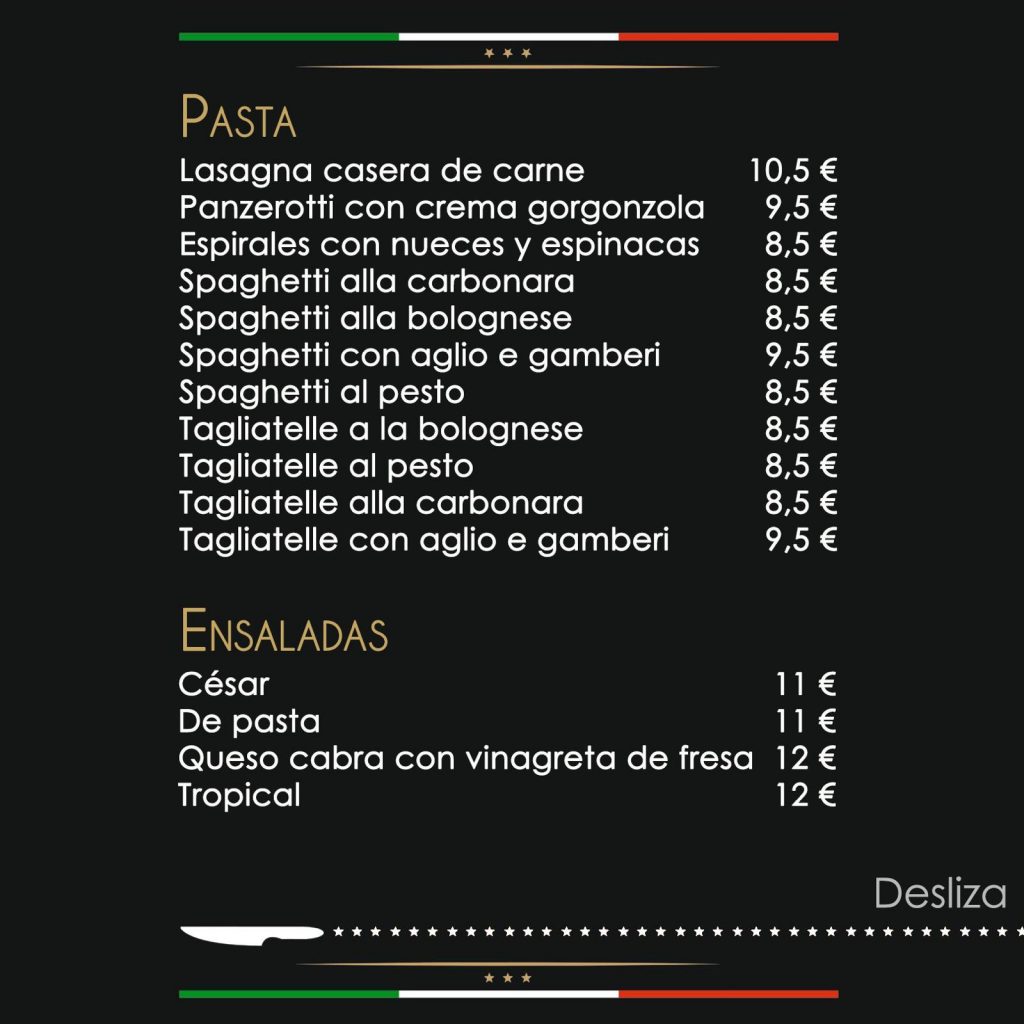 El restaurante propone una gran variedad de platos para todo tipo de paladares. Entrantes como croquetas caseras de jamón, de bacalao o mixtas; provolone con verduras asadas, berenjenas rellenas de carne, patatas a la importancia o ensaladilla rusa figuran en la carta junto a una gran variedad de pizzas, pastas y ensaladas, además de segundos platos con gran tradición gastronómica como bacalao o atún con pisto, solomillo de cebón al roquefort, escalope de ternera a la milanesa o pechuga de pollo rellena de salsa de setas.