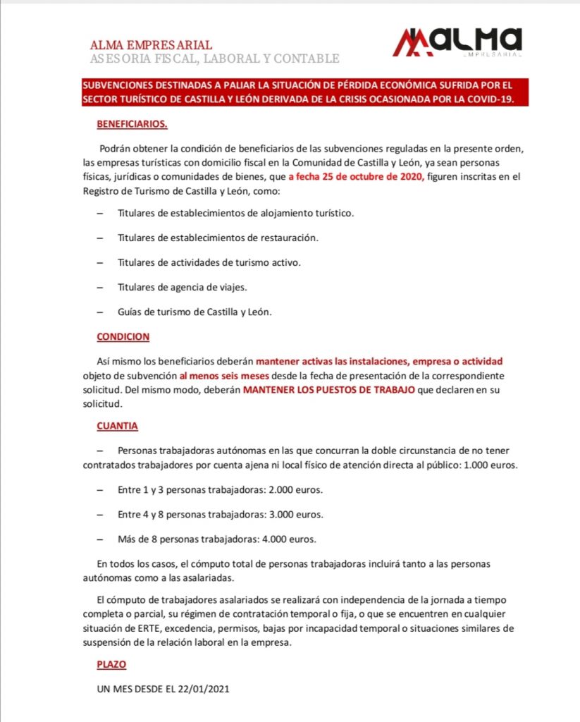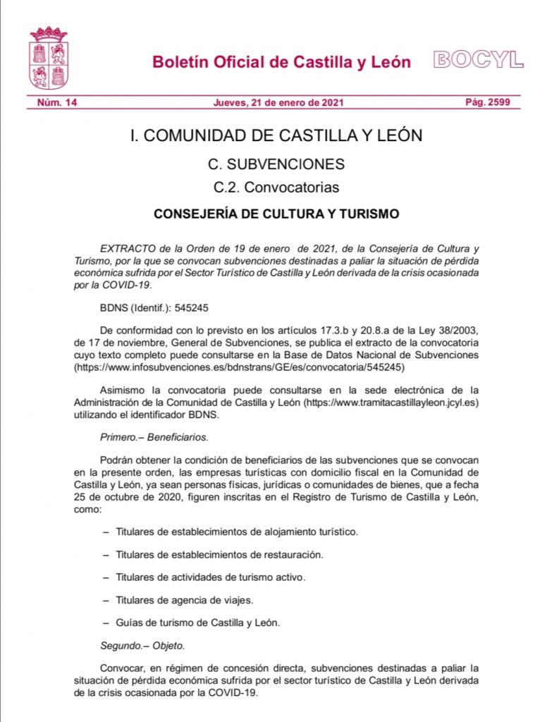 La Consejería de Cultura y Turismo de la Junta de Castilla y León convoca hoy en el BOCYL las ayudas para el sector de hostelería y turismo. Con unos fondos de hasta 20 millones de euros, esta ayuda podrá llegar a unos 10000 establecimientos de la Comunidad. El plazo de solicitud comienza mañana 22 de enero.
