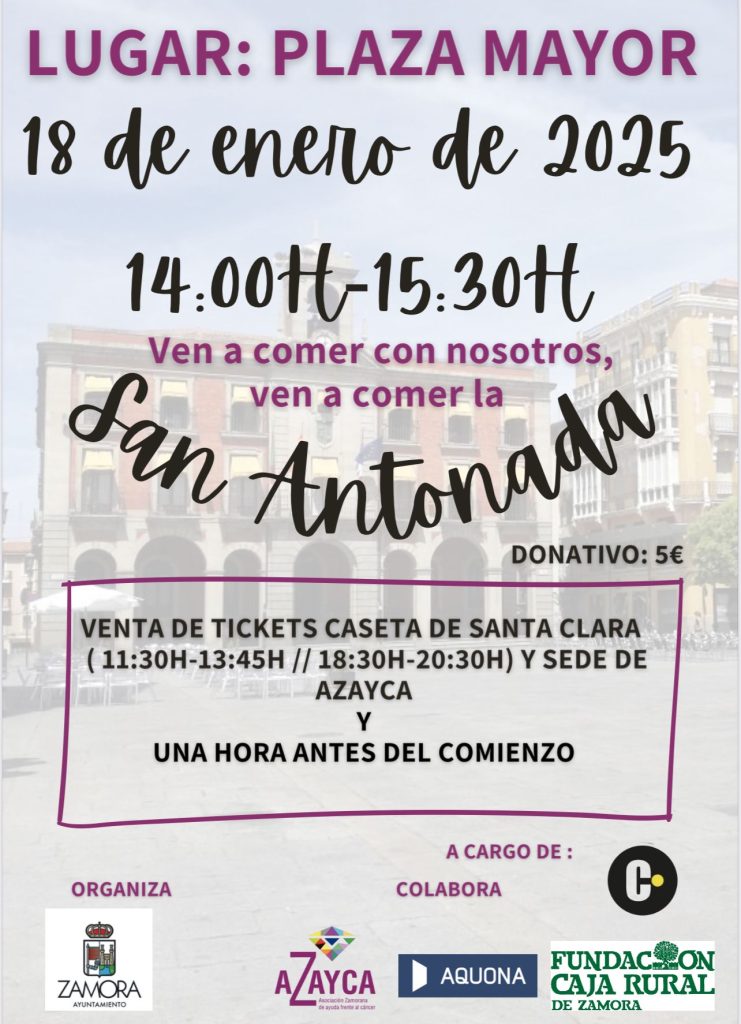 El Ayuntamiento de Zamora organiza hoy sábado 18 de enero una Sanantonada multitudinaria en favor de AZAYCA, la Asociación Zamorara de Ayuda a los pacientes de cáncer. Con motivo del día de San Antón, que se celebraba en la jornada de ayer, el Ayuntamiento de Zamora, a través de la Concejalía de Promoción Económica y con la colaboración de Aquona y Caja Rural, ha preparado una San Antonada multitudinaria para hoy sábado 18 de enero a partir de las 14 horas en la Plaza Mayor. Los tickets tendrán un precio de 5 euros, que irán íntegros a la asociación AZAYCA.