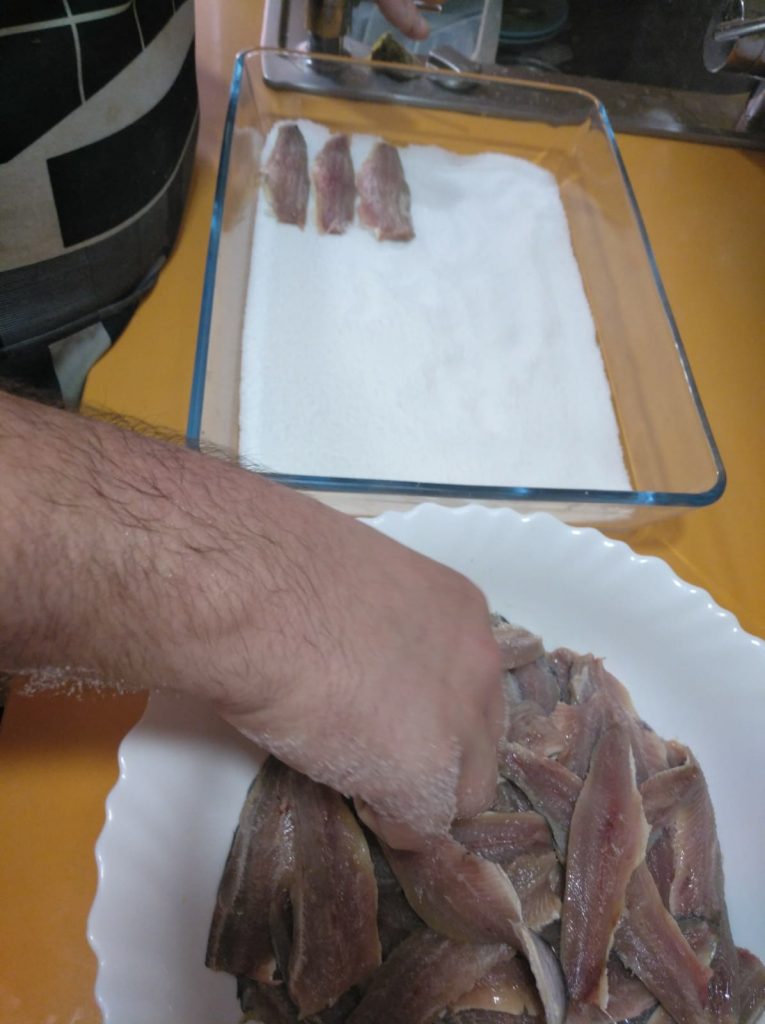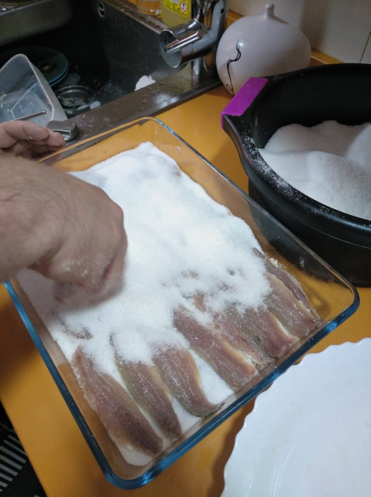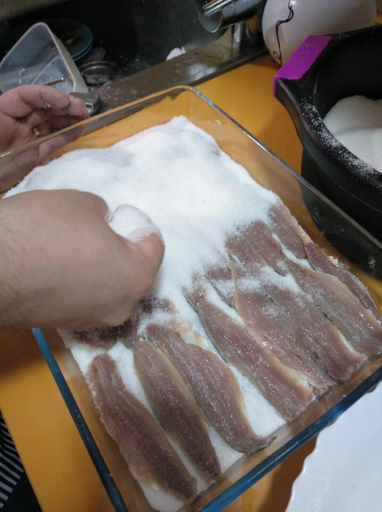 Por otro lado, hacemos la mezcla de sal y azúcar, ponemos en la base la mezcla y una capa de sardinas, cubrimos con la mezcla y otra capa de sardinas… y así hasta tener todas, hasta acabar con la mezcla de sal y azúcar.