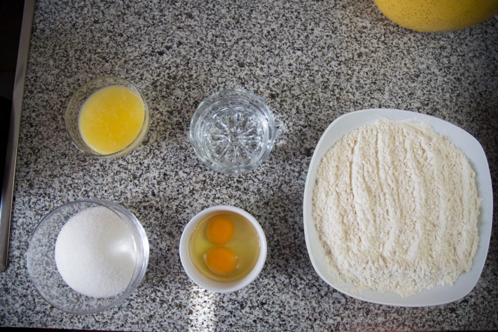 En un recipiente ponemos los huevos y el azúcar y batimos con la mano. A continuación añadimos la manteca (o mantequilla) y el vasito de aguardiente y continuamos batiendo hasta que el azúcar se deshaga.