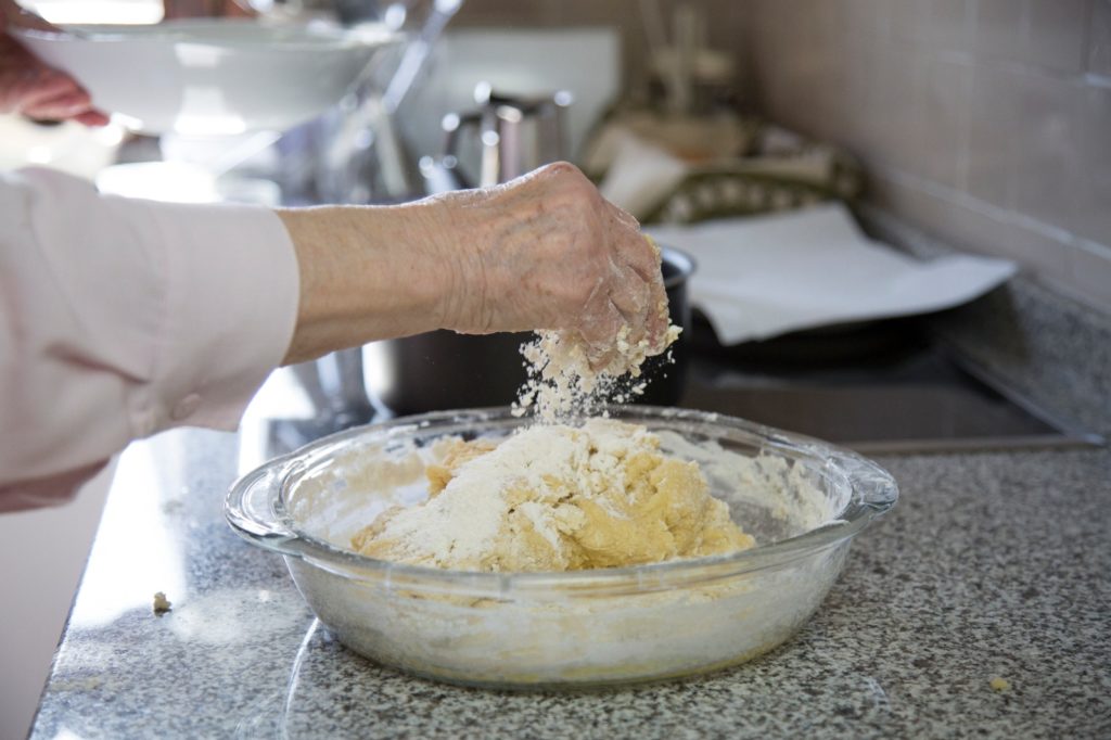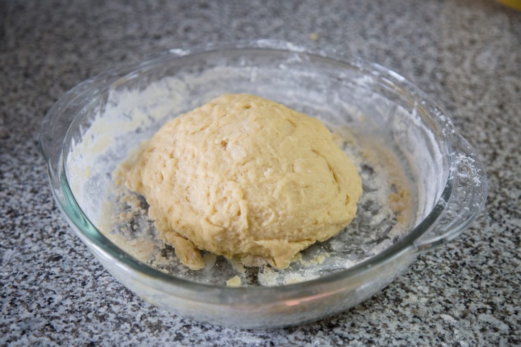 Añadimos después la harina y el bicarbonato bien mezclados y seguimos amasando hasta que no se pegue la masa a las manos. Hacemos bolitas del tamaño de una nuez.