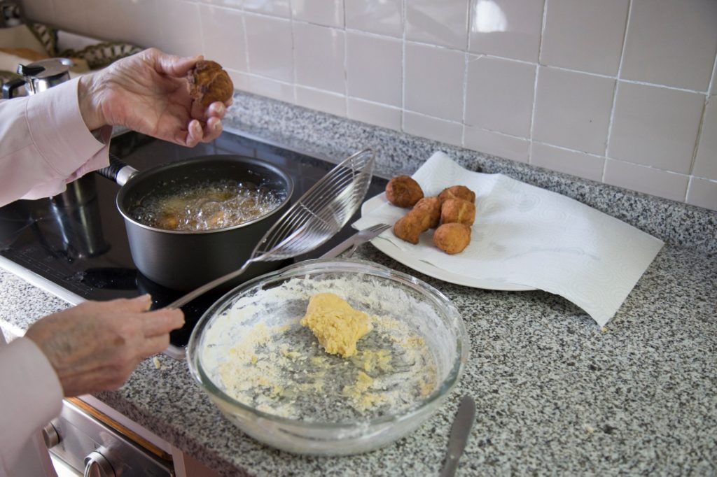 Ponemos en el fuego una sartén grande y honda con el aceite y la manteca a partes iguales (un litro aproximadamente) y freímos las bolitas sin dejar calentar demasiado el aceite para que se doren bien por fuera y no queden crudos por dentro,
