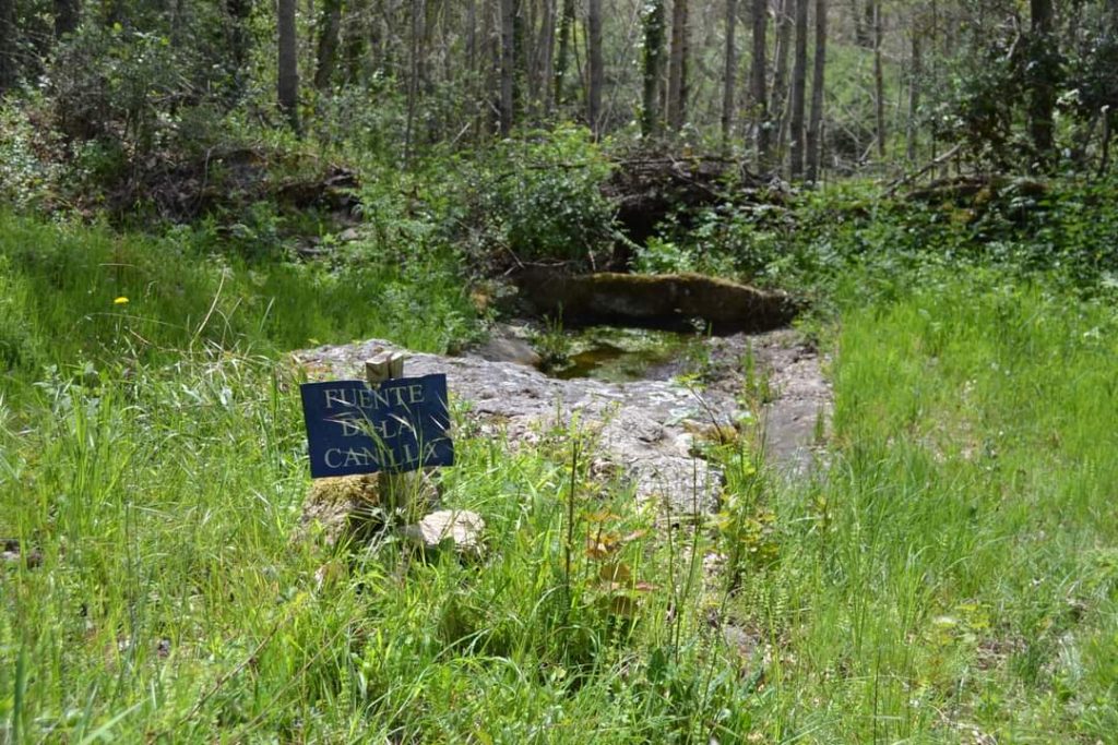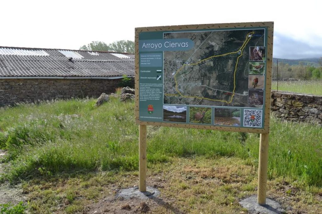 En una pequeña plaza con una farola en el medio ya se divisa el cartel con las indicaciones de seguimiento de la ruta, balizada con colores blanco y verde y que discurre paralela a prados, acompañando en buena parte de su trazado al arroyo Ciervas.
