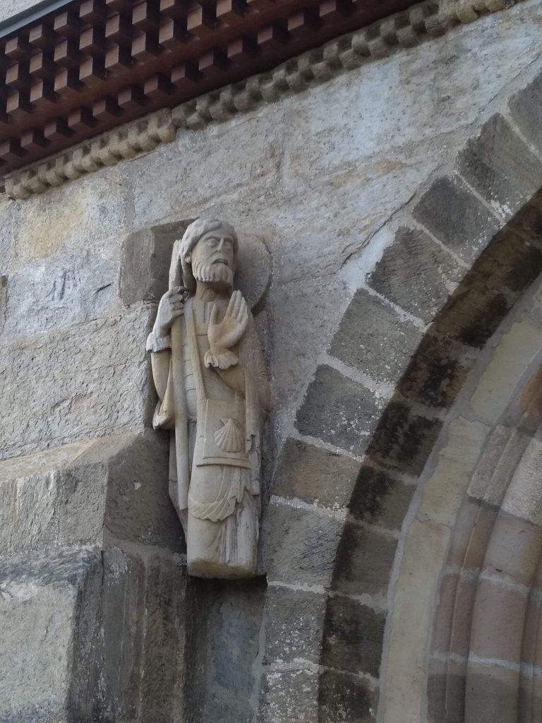 Frente a la escultura, al otro lado de la puerta, otro apóstol menos reconocible -la mayoría de estudiosos consideran que se trata de San Pedro, otros creen que San Juan– muestra referencias a los dos grandes centros occidentales cristianos de peregrinación, Roma y Santiago de Compostela.
