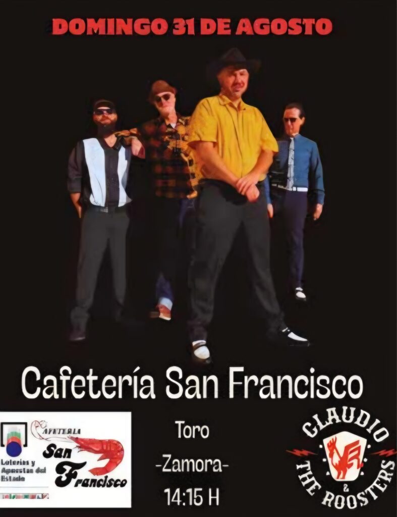 🎸 14:15 h – Vermú con Claudio and The Roosters📍 Plaza de San Francisco (organiza Bar San Francisco)