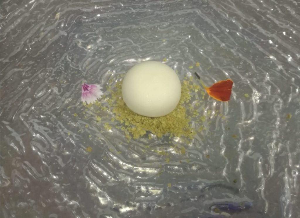 El bombón se presenta sobre tierra de almendras y té matcha.